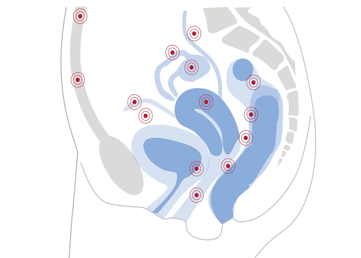Unter Zusammenführung der unterschiedlichen Konzepte wird davon ausgegangen, dass genetische Defekte und epigenetische Phänomene [8] sowie weitere Einflüsse die Voraussetzungen dafür bilden, dass bei der Implantation sowie der Metaplasie in einem für die Zellen fremden Milieu die für die Ausbildung der jeweiligen Endometrioseherde spezifischen Veränderungen stattfinden [1]. Es gibt eine große Zahl potenzieller Lokalisationen (Abb. 1).