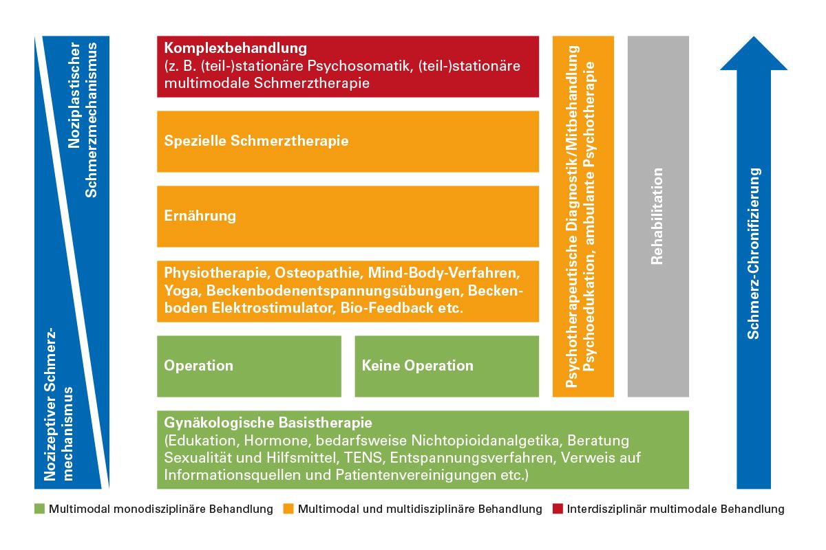 Die Kombination aus unterschiedlichen Therapieverfahren, wie medikamentöse Therapie und Physiotherapie, wird als multimodaler Ansatz bezeichnet. Eine parallele, aber nicht unbedingt in enger Abstimmung erfolgende Behandlung durch unterschiedliche Disziplinen (z. B. Gynäkologe, Schmerztherapeut und Physiotherapeut) entspricht einer multidisziplinären Behandlung.