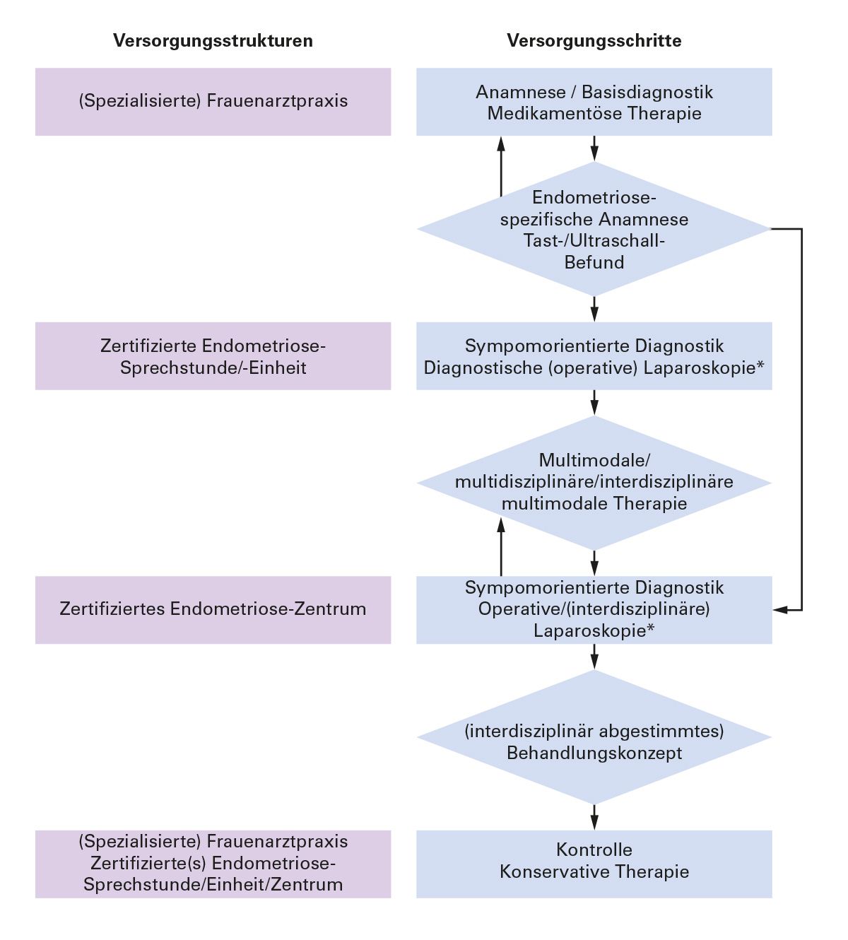 Das Therapieangebot in zertifizierten Rehabilitationseinrichtungen basiert auf dem bio-psycho-sozialen Krankheitsmodell und kann dem Bedarf der Frauen nach Information, Schulung, psychischer und sozialmedizinischer Unterstützung, Physio-, Balneo-, Ernährungs- und sonstiger Therapien durch ein multidisziplinäres und multiprofessionelles Team entsprechen. Die mögliche Zusammenarbeit zwischen gynäkologischen Praxen und spezialisierten Endometriosezentren ist in Abbildung 5 dargestellt.