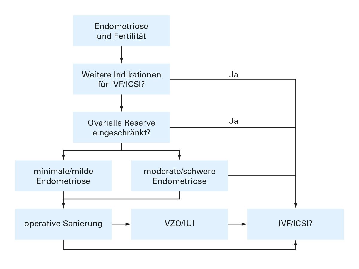 Maßnahmen der assistierten Reproduktion gewinnen zunehmend an Bedeutung. In Studien konnte gezeigt werden, dass bei Inseminationen mit Ovulationsinduktion eine geringe Verbesserung der Schwangerschaftsrate im Vergleich zu Spontanzyklen bei Patientinnen mit Endometriose im Stadium 1 und 2 erreicht wurde [34]. Abbildung 6 gibt eine Übersicht zu Therapieoptionen bei Endometriose und Kinderwunsch.