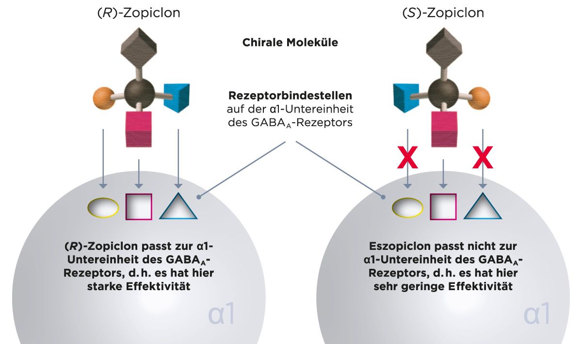 - Zopiclon und Eszopiclon wirken zwar beide am GABAA-Rezeptor, allerdings unterscheiden sie sich in ihrer jeweiligen Bindungsaffinität. Der GABAA-Rezeptor ist aus verschiedenen Untereinheiten aufgebaut, wobei vor allem die α-Untereinheiten für die Wirksamkeit wichtig sind. Die Bindung an diese α-Untereinheiten vermittelt dabei unterschiedliche Wirkungen. In vitro wurde bereits 1993 gefunden, dass das (S)-Enantiomer (Eszopiclon) als Eutomer eine etwa 50fach höhere Affinität zur Benzodiazepin-Bindungsstelle des GABAA-Rezeptors besitzt als das Distomer (R)-Zopiclon [1, 26]. So besitzt Eszopiclon die größte Effektivität an den α2- und α3-Untereinheiten. Darüber werden anxiolytische, muskelrelaxierende und analgetische Effekte ausgelöst. Zopiclon hingegen zeigt die größte Bindungsaffinität an den α1- und α5-Rezeptoruntereinheiten. Die Bindung an die α1-Untereinheit vermittelt sedierende Effekte und kann Substanzverlangen sowie Absetzsymptome verursachen. Eszopiclon hat dagegen nur eine geringe Affinität zur α1-Untereinheit. Daraus erklärt sich, dass Eszopiclon zwar eine schlaffördernde Wirkung aufweist, aber gleichzeitig das Risiko für ein mögliches Substanzverlangen erniedrigt wird, zum Beispiel bei Patienten mit anamnestisch bekanntem Alkohol- und Drogenabusus.