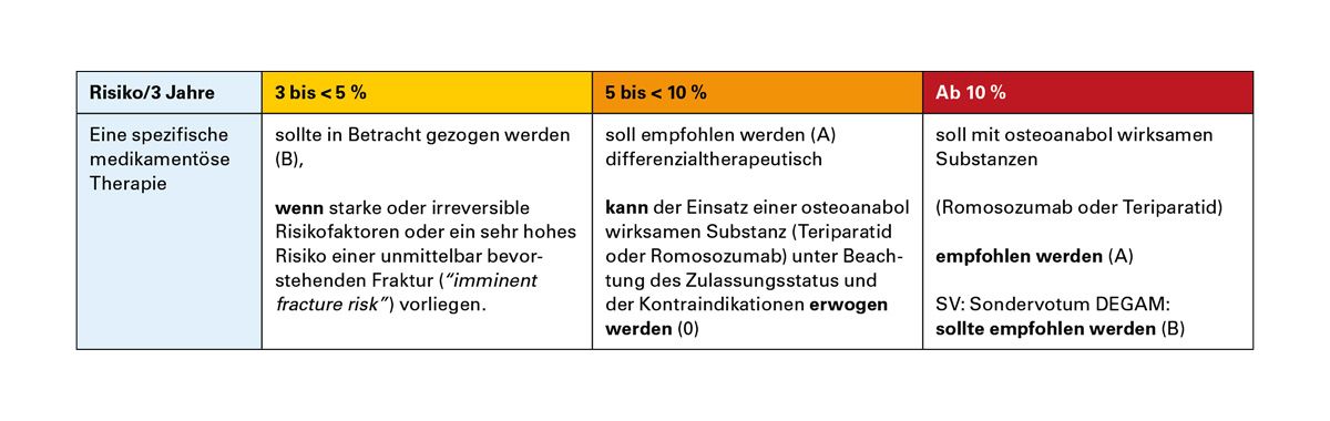 Bei einem 3-Jahres-Risiko von ≥ 10 % oder bei Vorliegen eines hohen imminenten Frakturrisikos wird der bevorzugte Einsatz osteoanabol wirksamer Substanzen empfohlen, sofern keine Kontraindikationen bestehen.