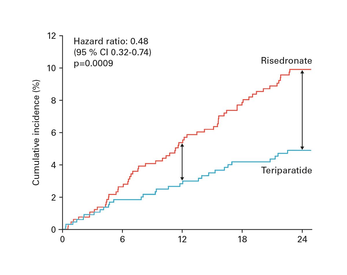 Abb. 2: Teriparatid reduziert das Risiko für neue Frakturen um 50 % vs. Risedronat [15].